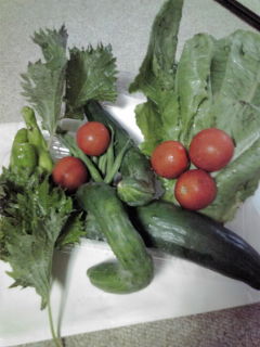 彰さんのこまめな手入れが見事な”結実”となり「私 いただく人!」役をしっかりとやってきました。あ〜幸せ、ネッ胃さん。写真:(戴いた野菜の数々。曲がったきゅうりが値うちもの)