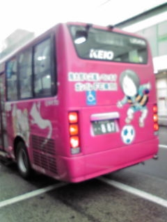 秋雨けぶるなか「鬼太郎絵入りバス」は今日もいつも通り調布の町を走っています。写真:(カラフルなバス)