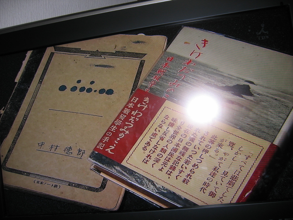 写真:(左ー中村徳郎氏直筆のノート(きけわだつみのこえ原書ーTBSTVより)