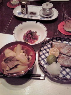 今日は私には今秋初の秋刀魚の塩焼き。そして山形の郷土食芋煮とモッテ菊の酢の物。食材は銀座の山形館で求められたそうで新鮮。かの被災地でも「芋煮」は大変喜ばれたと聞いていましたが本当にそう思いました。家庭の味でよく味が沁みた里芋はトロトロ。お替りをしたほどです。