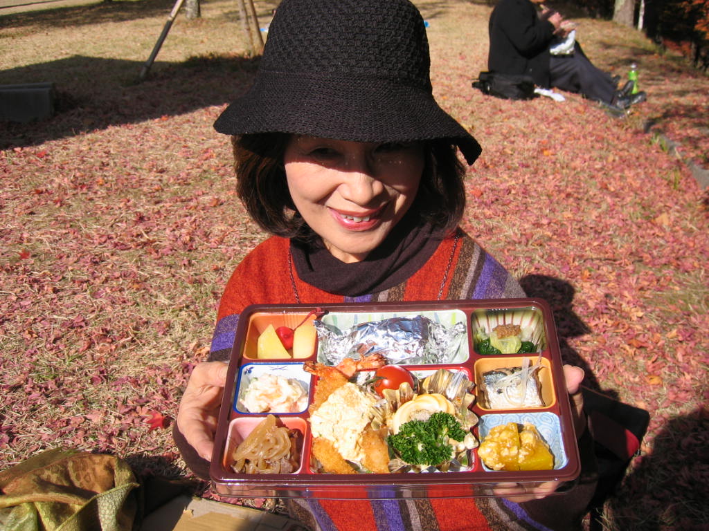 もみじ湖畔の広場で皆さんとゴザ敷いていただいた昼食。凄いご馳走そして美味しそうでしょ!開けたとたん「わあ!バランスよくお肉もお魚も野菜もフルーツも〜〜」とひとしきり叫んだのは私一人ではありませんでしたよ。