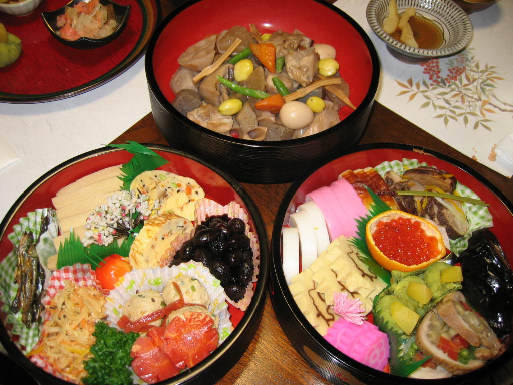 今年の新作は「豚肉のタリアータ」「鶏肉のゆず胡椒風味」などです。いずれの料理も丁寧に時間をかけてコトコト煮つめたり、ソースに一工夫したものです。お陰で口うるさい娘の好評を得ましたよ! 写真:(頑張って作ったおせち類)