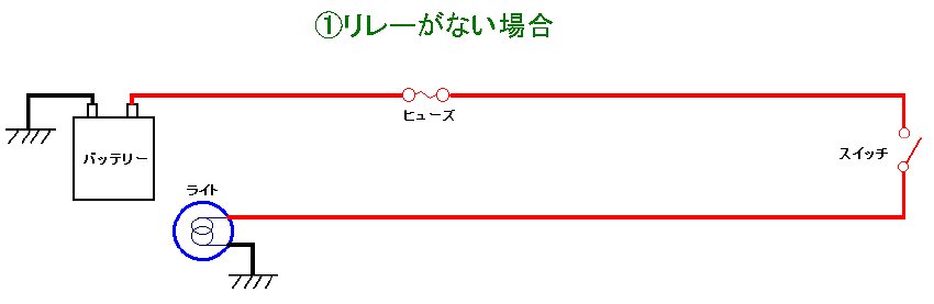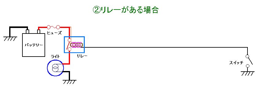 リレーがない場合,バッテリーからの電源コードは電装品に接続する前に車内のスイッチを通さなくてはなりません。 延々と車内まで続く長いコードとコネクター類により大きな電圧ロスが生じます。 |