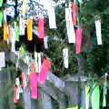 近くの布多天神社の本殿 その両脇に 短冊がいっぱい下げられた笹飾りが2本ありました。カラフルな短冊には ハングル 英語 あるいは かわいい字で 〜〜さまざまな願い事が 書かれています。