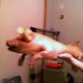 ほら・・ネッ 「子豚さん」こうして炭火で丸焼きしたんですよ。下準備は勿論彼一人の手で〜〜。この料理名は「鴻運當頭」といって幸運をもたらすと言う意味で 祝席では最初に出されるそうです。拙い私の携帯カメラじゃ 豚ちゃんの目玉に「ピカッ〜〜」と灯りが付いた心憎い演出が写っていません ゴメンナサイ!