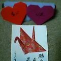 (写真: 鶴付きの激励ハガキと心の折り紙2個)