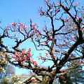 見上げた青空。もう満開を過ぎかけた梅。1本の木から紅白の可憐な花が空を突いていました。