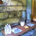 打ち水された玄関は縁台風情でお出迎え。まさしくホッと一息。 清水 うちわ 大鉢には紫陽花をメインに 投げ入れの豪快な山の花々。おや奥には置物のタヌキの夫婦がユーモラスにお腹をだして・・・。裸の付き合いを!!と言ってくれているようでした
