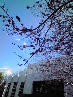 いつもの電通大学通りの紅梅がもうこんなにふくらみ空は青く高かったです。この大学で今2次試験真っ最中。規制が張られてますので、その後の春の兆しのバロメーターが、覗けません。