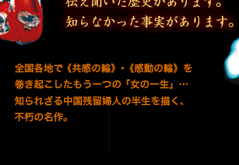 その幸福も日本の敗戦によって激変する。逃避行の中で春代は我が子を手にかけ、匪賊に襲われ、夫にも見捨てられる。置き去りにされた彼女を助けてくれたのは中国人の王才人。彼との間に子供も産まれ、再び新しい家族と幸せを見いだしたのもつかの間、中国全土に吹き荒れた文化大革命の嵐で彼女の家族はバラバラに・・・